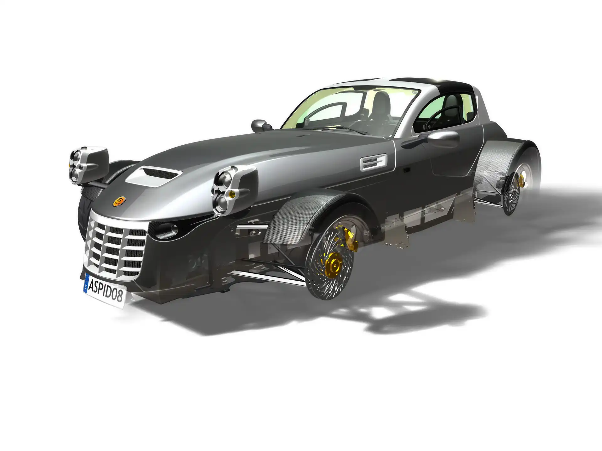 В основе Aspid - пространственная рама с деформируемыми зонами, которая стоит на алюминиевой подвеске. Кузовные панели изготовлены из алюминия и углепластика. Но самое необычное в машине - тормоза. Это плавающие диски (спереди сдвоенные) со сложной проточкой, которая обеспечила прекрасный отвод тепла и снижение веса тормозов на 70%. В итоге после таких ухищрений машина весит всего 700 кг.