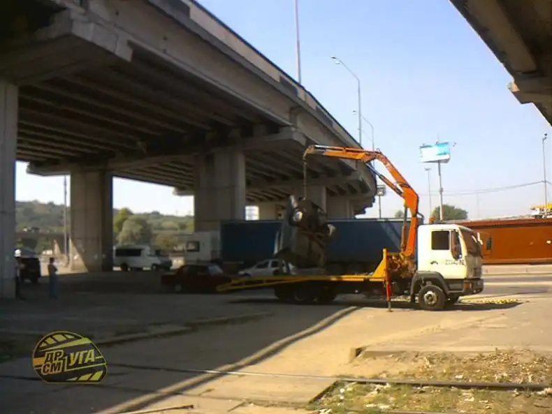 В Киеве, на путепроводе, возле ст. м. «Выдубичи», BMW 5-ой серии свалилась с 30-метровой высоты.