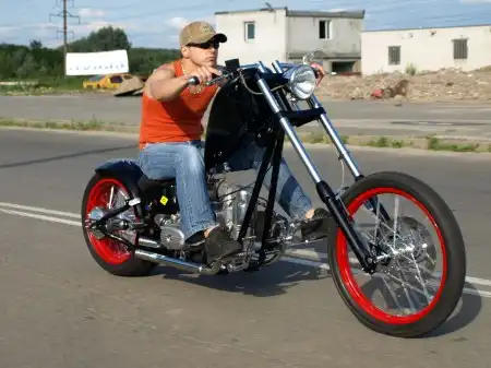 Задумав проэкт COOLDRUG CHOPPER, я понял что так просто моя затея не обойдётся, и купил сварку-болгарку. Без стапеля конечно было тоже не обойтись, трубогиб, "английское колесо", на это ушло месяца три-четыре... После чего нашелся двигатель ИМЗ. С задним ободом и резиной помогли ребята из ART MOTO г.Кировоград,за это отдельное им спасибо! Раму делал по началу на глаз,собрал на прихватках, поставил на колёса, всё понравилось,потом выставил и обварил в стапеле. Долго не мог найти б.у. амортизаторы от HD softail, они в нём на растяжку работают, пришлось напряч сестрёнку в Германии,там с этим барахлом попроще. Приехали два,но место нашлось только для одного,зажал не много пружину, получилось то что надо. Когда встал вопрос с баком,заехал к ребятам в мастерскую по изготовлению рыцарских доспехов. Через пару дней вернулся с раскроеным листом метала, получил короткий ликбез, и после соттысяч ударов молотком получился бак. Скрутить переднее крыло с небрежно припаркованного в тёмном переулке трактора "Беларус" не удалось. Нашол базу, купил, перекроил и подогнал по радиусу. Потом была покраска и сборка.