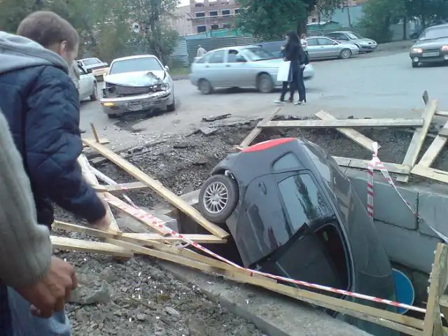 ну и причём тут дороги на фото ясно видно что что дорога там в отличном состоянии и место проведение ремонтных работ было ограждено а машину туда столкнул другой автомобиль а по какой причине это уже тайна покрытая мраком может водила тупняка словил а может и машина не исправна а может это изощрённая месть)))