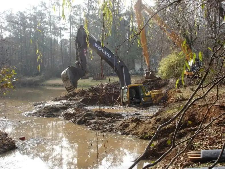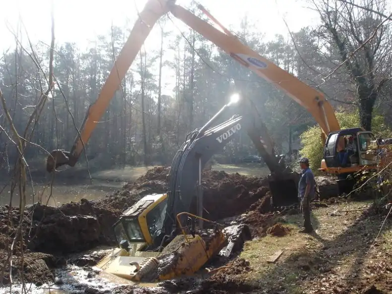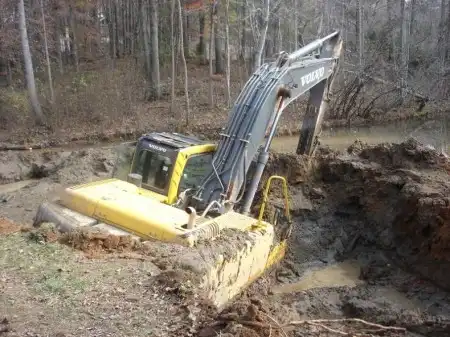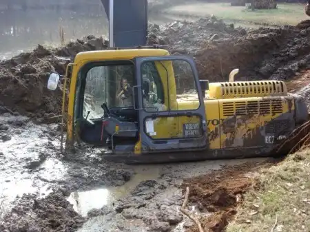История: Экскаватор пытался достать маленький погрузчик (которого уже не видно на фотографиях) и утонул сам.