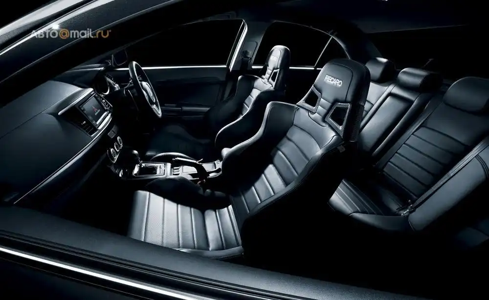 Внутри новый EVO X практически везде отделан кожей, а места спортивных кресел заняли гоночные ковши Recaro. Также в GSR-edition серийно устанавливается 30-гигабайтная мультимедийная система Rockford Fosgate со встроенной навигацией, девятью динамиками и сабвуфером.