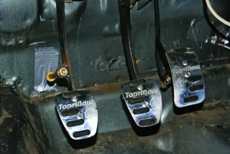 Интересно устроена тормозная система – передние тормоза здесь меньше, чем задние! Предполагается, что большая часть веса приходится на задние колеса, а значит, тормозят в первую очередь именно они. На ведущей оси стоит комплект «Прома спорт» под 17” колеса, на передней – 15”. Регулятор тормозных усилий Tilton настроен так, что задние тормоза схватывают заметно раньше передних.