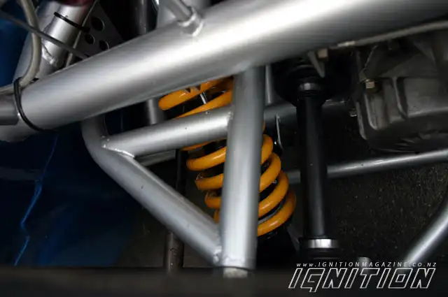 Выполненная на заказ хром-молибденовая двухрычажная передняя подвеска с регулируемыми койловерами Koni, усилены все сайлентблоки и шаровые соединения, новые усиленные рычаги, задние регулируемые стойки Koni, усиленные подшипники на ступицах, задняя распорка Cusco, пружины стоек King Springs Competition.