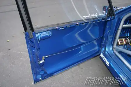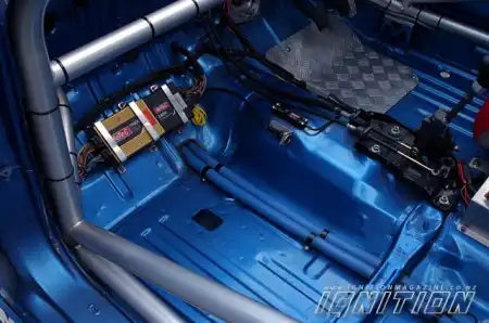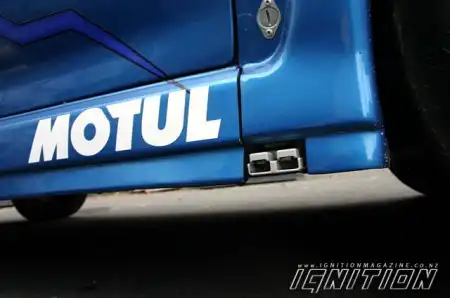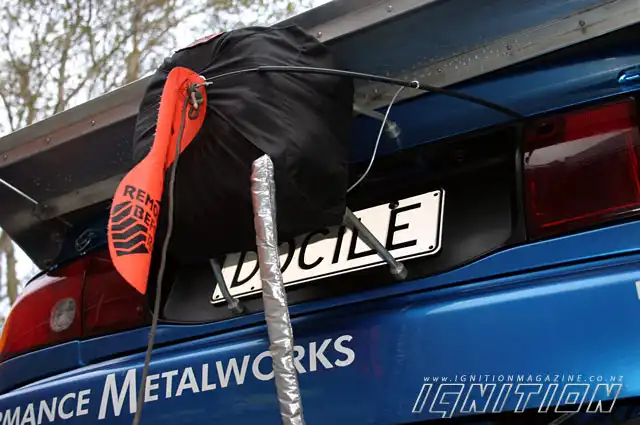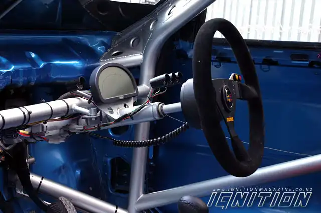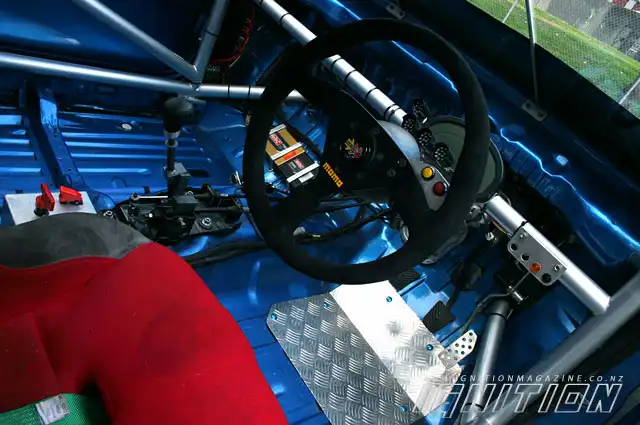 После того как большая часть этого Evo отправилась ржаветь на задний двор STM, пришло время восстановить утраченную жесткость кузова, что и сделали, вварив «мясистый» каркас. Одобренный для использования в столь быстрых автомобилях и имеющий сертификат ассоциации Новой Зеландии по драг-рейсингу, этот хром-молибденовый каркас был изготовлен и установлен Джоно из Performance Metalworks, настоящим виртуозом по металлу. В продолжение уничтожения фабричного облика был полностью выпотрошен салон. Оставили только самое необходимое. Место пилота состоит из спортивного ковша Racetech 4000, спортивного руля Momo, обтянутого замшей, отсечкой Motec с лампочкой, приборной панелью Motec и, самое важное, «ручкой Иисуса» — рычагом выпуска тормозного парашюта.