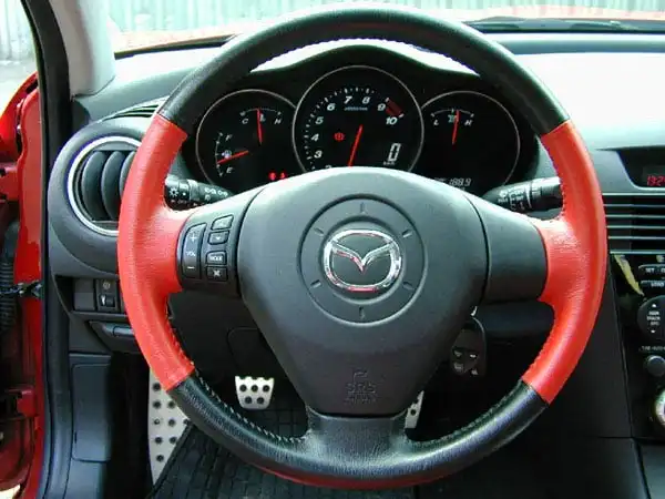 Салон Mazda RX-8 встречает водителя очень оригинальным «треугольным» стилем, намекающим на роторное сердце, живущее под капотом. Треугольные прорези в спинках сидений, треугольная ручка коробки КПП…