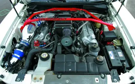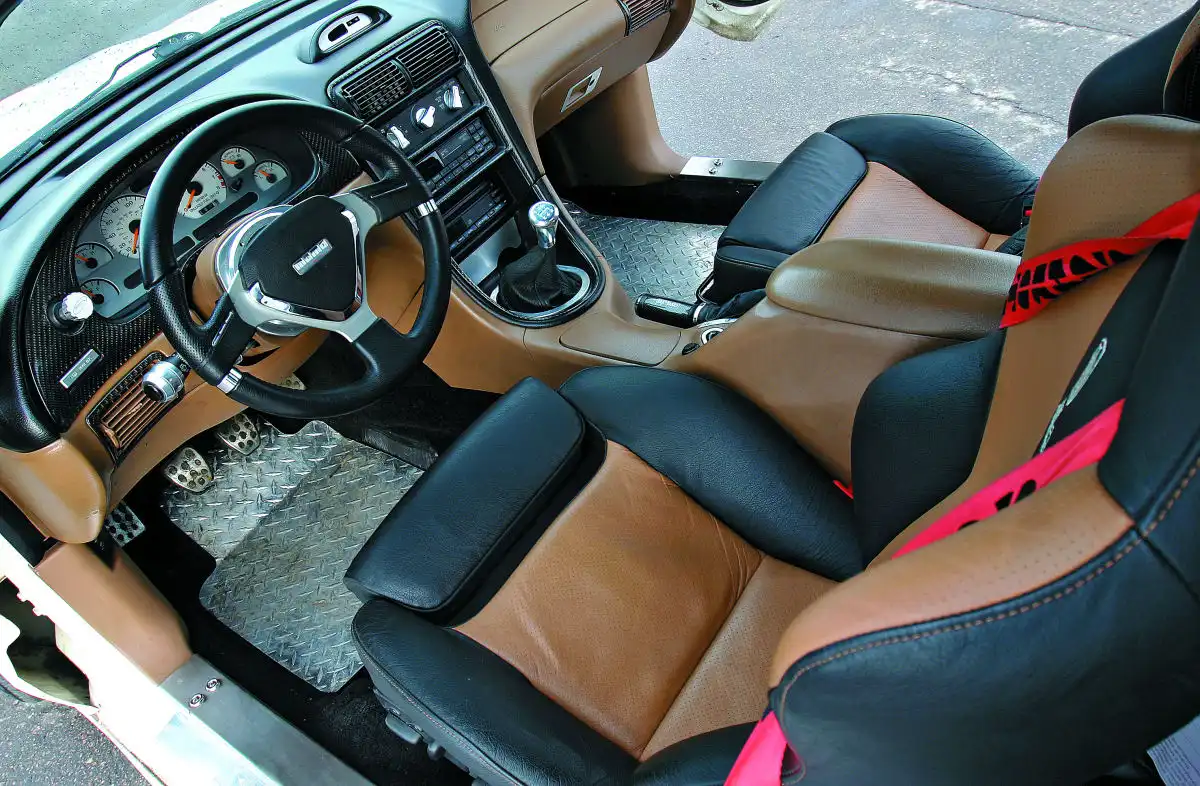 Те самые два года тюнинга ушли в основном конечно на технические совершенствования. Движок никак не хотел «дружить» с «Мустанговской» электроникой 1996 года. Настройка «методом тыка» длилась более года, притом «змейка» обзавелась «мутированной» проводкой, спец блоками и уникальными настройками. Но Cobra не поехала так как надо. Затем провели еще несколько сеансов настройки электроники и устранили проблему с топливной системой, разобрав при этом машину по болтикам, но Mustang опять не поехал.