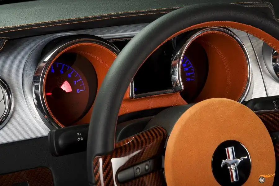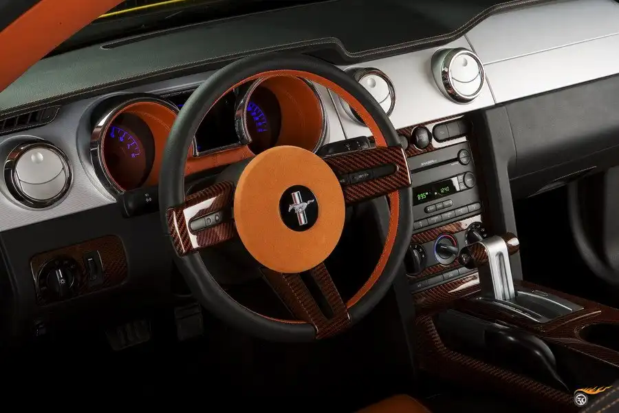 Согласно дизайн-проекту все сиденья перешили натуральной кожей черного и оранжевого цвета. Боковины и подголовники при этом оставили черными, а оранжевыми сделали центральные вставки. Сами подголовники передних сидений украсили логотипом Ford Mustang. В схожем стиле был перешит и задний диван с непременным украшением верхней части сиденья логотипом в виде мчащегося скакуна. Решение по использованию в центральной части сидений более светлой кожи позволило зрительно расширить объем салона, который и без того был довольно просторным. Сосредоточение черной кожи по уровню верхней части дверной линии визуально разделило пространство салона на светлый потолок и более темный, функциональный низ.