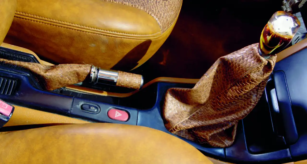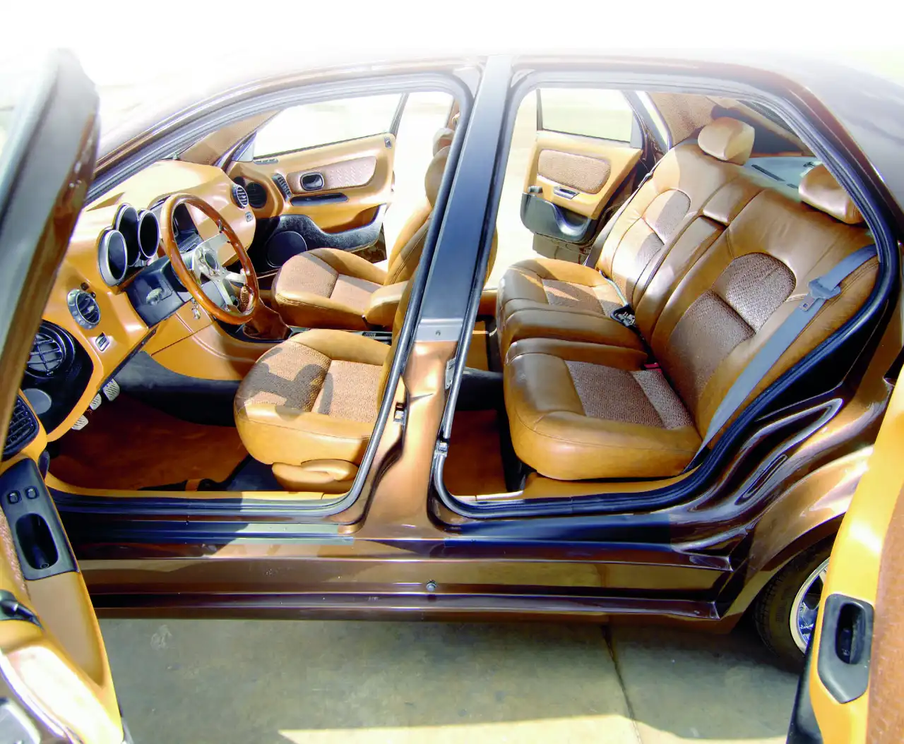 Как ты можешь догадаться (или посмотреть на фотки), машина Пако блещет не только снаружи, но и внутри. Взглянув на интерьер, трудно сказать какому автомобилю он принадлежит. Он напоминает несколько тачек одновременно, а все потому что приборная панель от Porsche, а приборы от Alfa Romeo 147, хотя сами циферблаты приборов родные от Laguna, адаптированные вручную. В салоне все в тонах «вареной сгущенки» и это не только контрастирует с кузовом, но и просто приятно глазу. Обивкой кресел и драпировкой дверных панелей занимались ребята из Cator - еще одна команда специалистов. Они не пожалели натуральную кожу разных текстур коричневых оттенков, чем придали седану штрих люксовости. Деревянный руль в прошлой жизни принадлежал какому-то олд-таймеру, а набалдашник КПП старому Mercedes. Багажник «фрикслера» укомплектован аудиокомпонентами, которые туда бережно вмонтировали два чудных парня (кстати, обоих зовут Дани) из компании 100% Motor и специалисты Quality Sound в лице Хосе и Мартине. Подробности они нам не сообщили, но любой мало-мальски разбирающийся в автозвуке человек поймет - багажник этой «лагуны» набит тем, что надо.