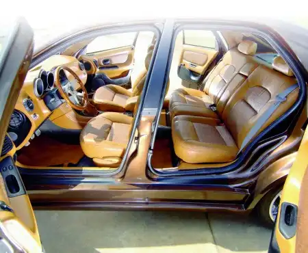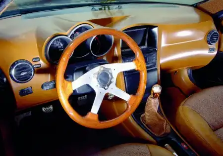 Чтобы с самых первых дней «лагуна» стала похожа на Chrysler, испанские энтузиасты поставили оригинальную «морду» 300С, включая: передний бампер, крылья, капот и оптику. Было решено отправить штатную решетку радиатора на полочку и установить стильную хромированную решетку от DUB, с таким же брутальным узором, как на 20” дисках той же фирмы. В официальном сервисе Chrysler на машину были установлены зеркала заднего вида с хромированными каркасами – некая «нотка тюнинга». Испанцы вообще часто любят упоминать выражение «нотка тюнинга» и у данной 300-ой «лагуны» такая нотка кажется во всем. В кузове автомобиля ты не признаешь ни одной родной кузовной панели от Laguna – правильно, потому что их там и нет, зато есть новые двери суицидного типа, как на машинах 30-х годов. Когда все четыре двери распахнуты это и смотрится необычно, и позволяет комфортно разместиться дружной компанией, потягивать мартини и гордится, что такое есть только у тебя. Задняя часть машины далась энтузиастам не легче, чем все остальное. Здесь больше всего пришлось поработать руками – основным «инструментом» ребят из Hot Road. Сначала подогнали заднюю дверь, бампер и фонари от 300С, а потом при помощи замазки, фибры и огромного терпения, стали придавать формы «крайслеровского» седана. Когда «попка» Laguna стала похожа на 300С, командой Thunder была установлена парочка хромированных выхлопных труб. Трубы смотрятся грозно, престижно и оттягивают на себя внимание.