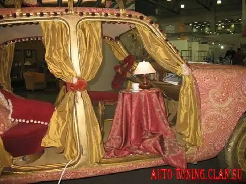 C помощью текстильного тюнинга Москвич 407 превращен в роскошный элемент декора. Автомобиль обит тканью снаружи и внутри. Металлические детали выкрашены "под старое золото". Из авто демонтирован мотор и другие детали в которых нет необходимости. Салон машины переделан под гостиную в классическом стиле.