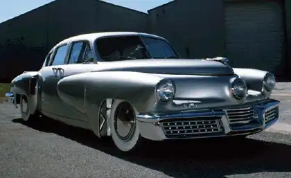 Только что победоносно закончилась Вторая мировая война. Будущее казалось безоблачным, обещало прогресс и всеобщее процветание. Наряду с пластиком, шариковыми ручками и персональными вертолетами публике пообещали «Автомобиль будущего». И он не замедлил появиться в образе прототипа Tucker Torpedo. В 1945 году в США был отменен действовавший в годы войны запрет на производство легковых автомобилей. Не имея в своих активах новых проектов, и «Большая Тройка», и другие компании в спешном порядке выбросили на изголодавшийся рынок хоть и слегка обновленные, но порядком устаревшие довоенные модели. И вот на фоне этого унылого однообразия подобно вспышке сверхновой звезды появляется прототип Такера! Машина произвела ошеломляющее впечатление. Длинный, низкий, «зализанный» кузов с заостренным носом, покатой задней частью в стиле фастбек и крыльями мотоциклетного типа, поворачивавшимися вместе с передними колесами. Синхронно с колесами поворачивалась и дополнительная центральная фара в носовой части капота. Утопленные в крылья основные фары выдвигались и включались автоматически по команде никому тогда еще не известных фотоэлементов.