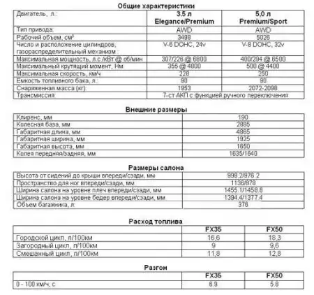 Оба мотора - и "шестерка" и V8 - работают в паре с адаптивным семиступенчатым "автоматом", пришедшим на смену пятискоростной КПП. К коробке претензий никаких – плавные, быстрые и почти незаметные переключения. А если хочется добавить "спорта", то можно купить самый "навороченный" FX50 Sport с подрулевыми переключателями из магниевого сплава, которые позволяют перещелкивать ступени в ручном режиме.