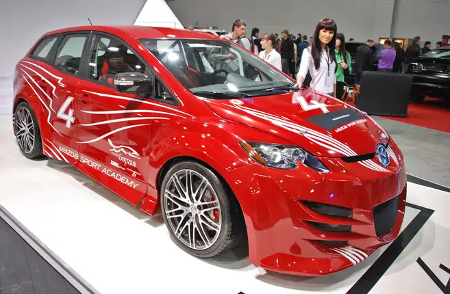 Создателям пришлось решать две основные проблемы – кузов CX-7 высокий, поэтому обеспечить хорошие аэродинамические характеристики и понизить центр тяжести оказалось непросто. Нужно было избавляться и от лишнего веса. В результате был установлен обвес, который на 10% увеличивает прижимную силу, дорожный просвет снижен на 70 мм, а масса «упала» на 300 кг.
