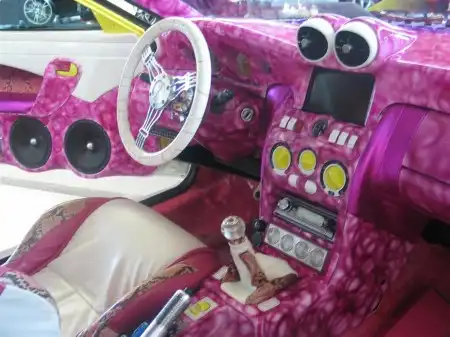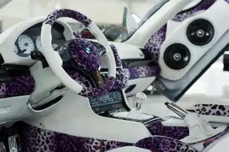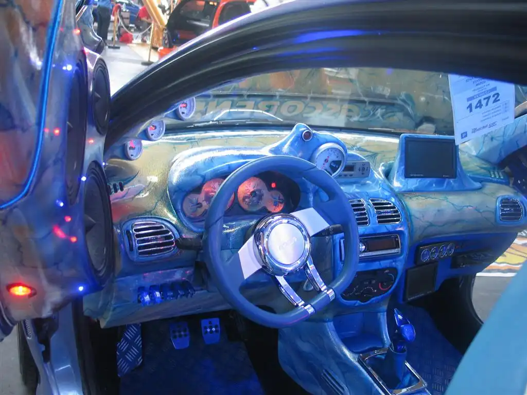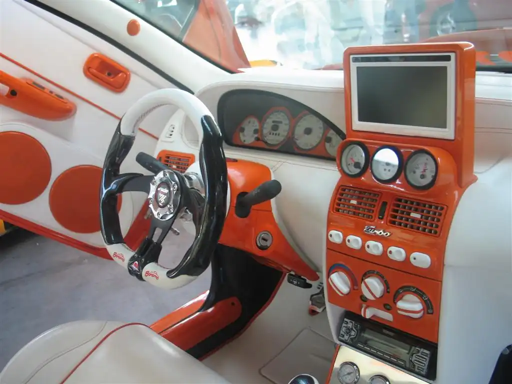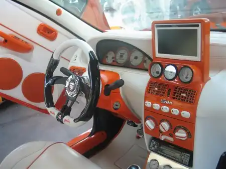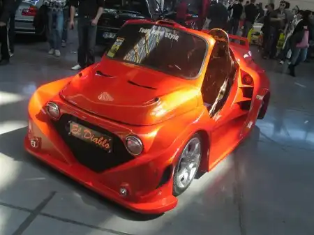 Исключительно радует глаз умение итальянцев подойди к оформлению машины с большим вкусом и изобретательностью. Особенно по части окраски кузова и новоприобретенных элементов декора салона. Среди интерьерных решений тоже встретилось немало красивейших работ. Частенько европейские инсталляторы злоупотребляют использованием крашеных конструкций из стеклоткани в салоне и багажнике, но если это сделано творчески и в комбинации с другими материалами, то выглядит здорово. А больше всех удивил один из вариантов оформления Fiat 500 New – его кузов был целиком покрыт снаружи… кожей, с текстурой под "змеиную".