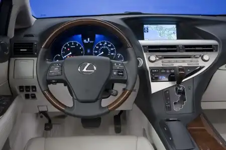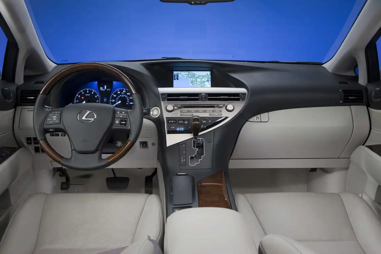 Автомобиль стал просторнее как снаружи, так и внутри. По сравнению с RX 350 предыдущего поколения, Lexus вырос на 15 мм, стал на 30 мм длиннее и на 40 мм шире. При этом ширина салона увеличилась сразу на 52 мм. Но главное даже не в увеличении размеров, а в общей смене стилистической направленности дизайна интерьера. На смену громоздким симметричным формам предыдущего поколения RX пришла оригинальная утонченная асимметричная компоновка со скошенной центральной консолью и инновационным джойстиком навигационной системы. Двухсекционная приборная панель в черно-синих тонах стала на порядок функциональнее. Революционный информационный дисплей, впервые выполненный на основе органических светодиодов, замечательно читается даже с пассажирского сиденья. Пустячок, конечно же, но приятно! Равно как и система автоматического отвода и возврата кресел, при выключении двигателя самостоятельно перемещающая рулевое колесо в самое высокое положение и отводящая водительское сиденье на 50 мм назад. Устроившись с ее помощью за рулем, нажимаем кнопку «старт», и настройки кресла и рулевого колеса автоматически возвращаются в исходное положение. Поехали!