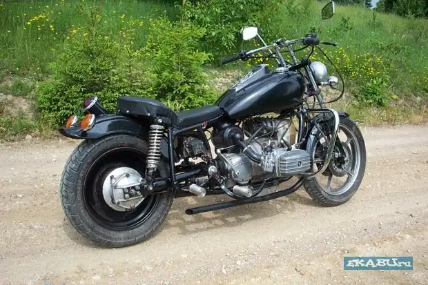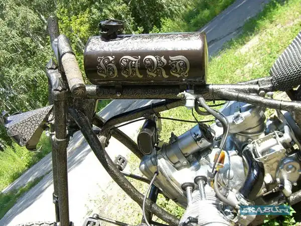 Аксессуары: руль от старого Днепра, стойки , рукоятки руля custom, крыло переднее от старого Кавасаки, крыло заднее от Ямаха Вираго, передняя вилка с мостами (основа старый Кавасаки), рулевая колонка , подножки Custome Chrome (CC), кардан Урал "Волк", маятник , седло - временное,