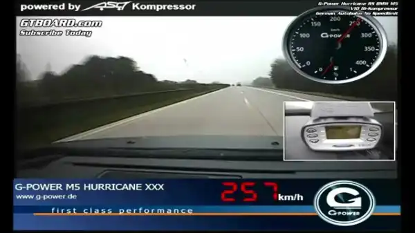 Но для рекордного автомобиля не случайно была выбрана «резина» Michelin Pilot Sport PS2 – эти шины рассчитаны на гораздо большую, нежели 340 км/ч скорость. Что и подтвердили заезды на гоночной трассе в Папенбурге, где G-Power M6 Hurricane CS разогнался до 372 км/ч. Первую сотню машина разменяла за 4,4 с, вторую за 9,6 с, а трехсоткилометровая отсечка осталась позади через 26 с. Таким образом, G-Power M6 Hurricane CS стал самым быстрым выпускаемым автомобилем BMW в мире.