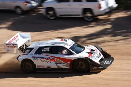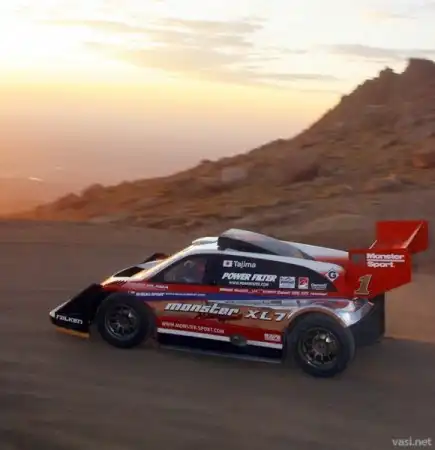 Но для начала вспомним рекордсмена – Suzuki XL7 Hill Climb Special 2007. Как несложно догадаться, автомобиль имеет также мало общего с большим джипом XL-7, как морская свинка с той свиньёй, что в шаурме. Если точнее – название и фары. Рама из труб, пластиковый кузов. Двигатель Chevrolet 3,6 литра. Две турбины. 1007 лошадиных сил. Имменно на ней Таджима сразу на 3 секунды побил рекорд Рода Миллера, который держался 13 лет.