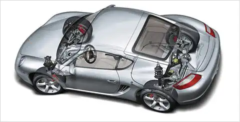 Поэтому Cayman спереди и сзади имеет подвеску McPherson с поперечными рычагами и амортизационными стойками. Для Porsche в этом нет ничего необычного. На характер в значительной мере влияет настройка подвески. Для Cayman было ясно: динамика двигателя должна была быть полностью перенесена на дорогу. Таким же четким, как и настройки ходовой части, должно быть ощущение от управления автомобилем. Поэтому мы наделили его широкой колеей и настроили пружины, амортизаторы и стабилизаторы с учетом высоких поперечных ускорений. Последовательное использование облегченных конструкций позволяет удержать на низком уровне как массу самого автомобиля, так и неподрессоренные массы. Почти все движущиеся детали подвесок изготовлены из алюминия.