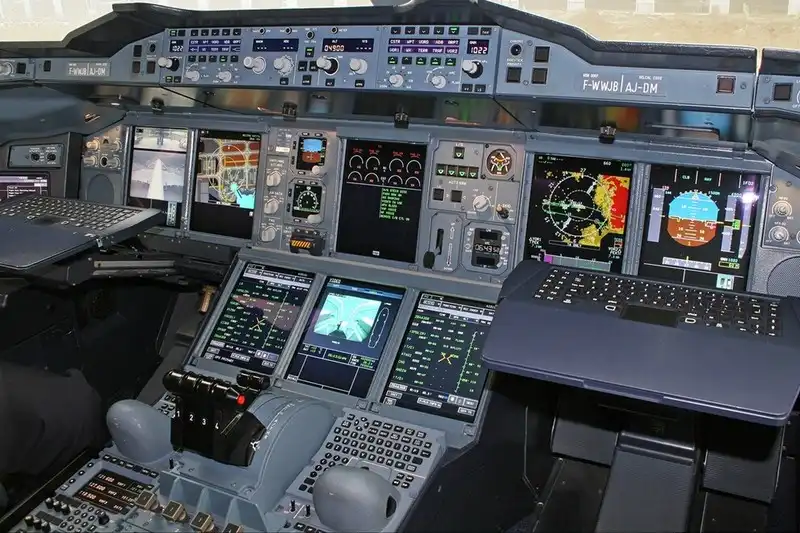 8) В Airbus A380 улучшенная стеклянная кабина и дистанционное управление рулями с помощью электроприводов, связанных с боковой ручкой управления. Устройства отображения информации в кабине экипажа: девять размером 20х15 см взаимозаменяемых жидкокристалических мониторов. Из девяти мониторов — два индикатора навигационных данных, два основных индикатора полётных данных, два индикатора работы двигателей, один отображает данные о текущем состоянии всей системы в целом и два многофункциональных индикатора.