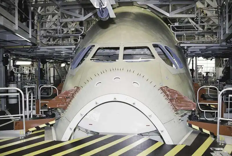 4) По словам разработчиков, самой сложной частью в создании самолёта стала проблема снижения его массы. Её удалось решить за счёт применения нового и революционного по своему исполнению композиционного материала. Из него сделан фюзеляж и крылья. В результате на 40 процентов Airbus А380 состоит из углепластиков.