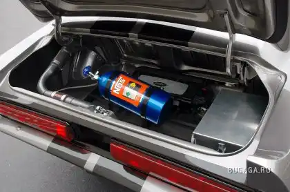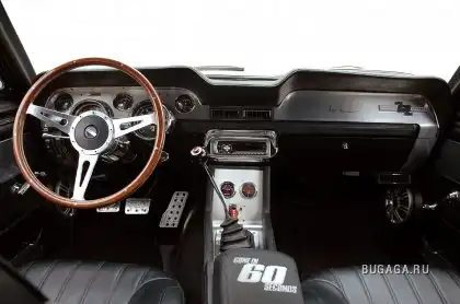 В Batistinha Garage & Speed Shop уже стояла одна «Элеонор» на реставрации – точная копия из фильма. И там решили, что делать то же самое будет слишком банально и скучно. Бразильские мастера предложил заказчику новаторский вариант – белоснежную GT500E, выкрашенную именно в тот легендарный лакированный цвет Wimbledon с парочкой полосок через капот, крышу и багажник, как у самых первых Shelby. Полоски окрасили в блестящий синий для придания элегантности. Оптика осталась оригинальной, но получила поддержку в виде ксеноновых фар дальнего света, дополнительных «малюток» по бокам от основных и парочку в бампере. Под капотом уже стояла очень грозная вещица объемом 428 кубических дюйма (около 7 литров), но бразильские ребята решили приберечь его для другого проекта, а заказчика уговорили прикупить 392 блок из каталога Ford Racing. Мотор объемом 6,4 л и мощностью 430 л.с. замечательно сменил оригинальный и вдобавок укомплектовался карбюратором Road Remon. И это было только началом, так как в машине поменяли более 400 деталей - оригинальными остались только колеса и задние сиденья. Авто снабдили амортизаторами Aldan и защитой картера, чтоб не погнуть об бразильские кочки новые агрегаты. Чтобы новый хозяин «Элеонор» смог переключать передачи, как Николас Кэйдж в Gone in 60 Second, была заказана надежная 5-скоростная коробка Tremec Extra Duty – почти такая же, как у дрэгстеров лиги NHRA, которые могут похвастаться мощностью 1200 л.с. Опять же, чтобы остальные комплектующие не отставали, на GT500 поставили тормоза PBR размерностью 13" спереди и 12" сзади. Колесные диски R17, как у большинства классических «пони-каров», обтянутые в резину 235/40 спереди и 265/40 сзади. Тюнинг этого Mustang соответствует доводкам гоночных экземпляров, а динамика лишь подтверждает. До 100 км/ч машина разгоняется немного больше, чем за 5 секунд, а максималка - где-то в районе 240 км/ч. Из оригинальной выхлопной трубы исходил легендарный «грохот», но по просьбе заказчика его сделали «звучным», как принято у тюнеров в наше время.