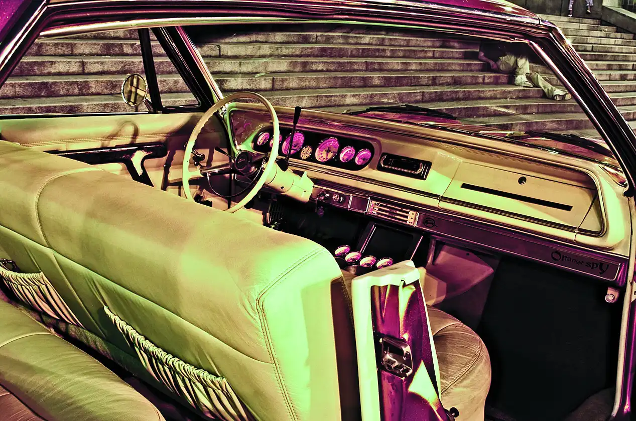 В первую очередь Бруно сделал шейвинг: убрал все молдинги, шильдики и дверные ручки. А потом переделал задние двери на суицидный манер, благо Impala конструктивно лишена средней стойки и жесткость кузова от такого тюнинга не пострадала. Затем машина была перекрашена. Низ – оранжевый, верх – кожаный. Да, мы знаем, что цвета такого нет. Но мастера использовали специальные приемчики, благодаря которым кажется, что верх машины обтянут кремовой кожей – с соответствующей фактурой трещинками. С американскими тачками так иногда на самом деле поступают, но Бруно поступил хитрее. Краска долговечнее и практичнее, а выглядит так же.