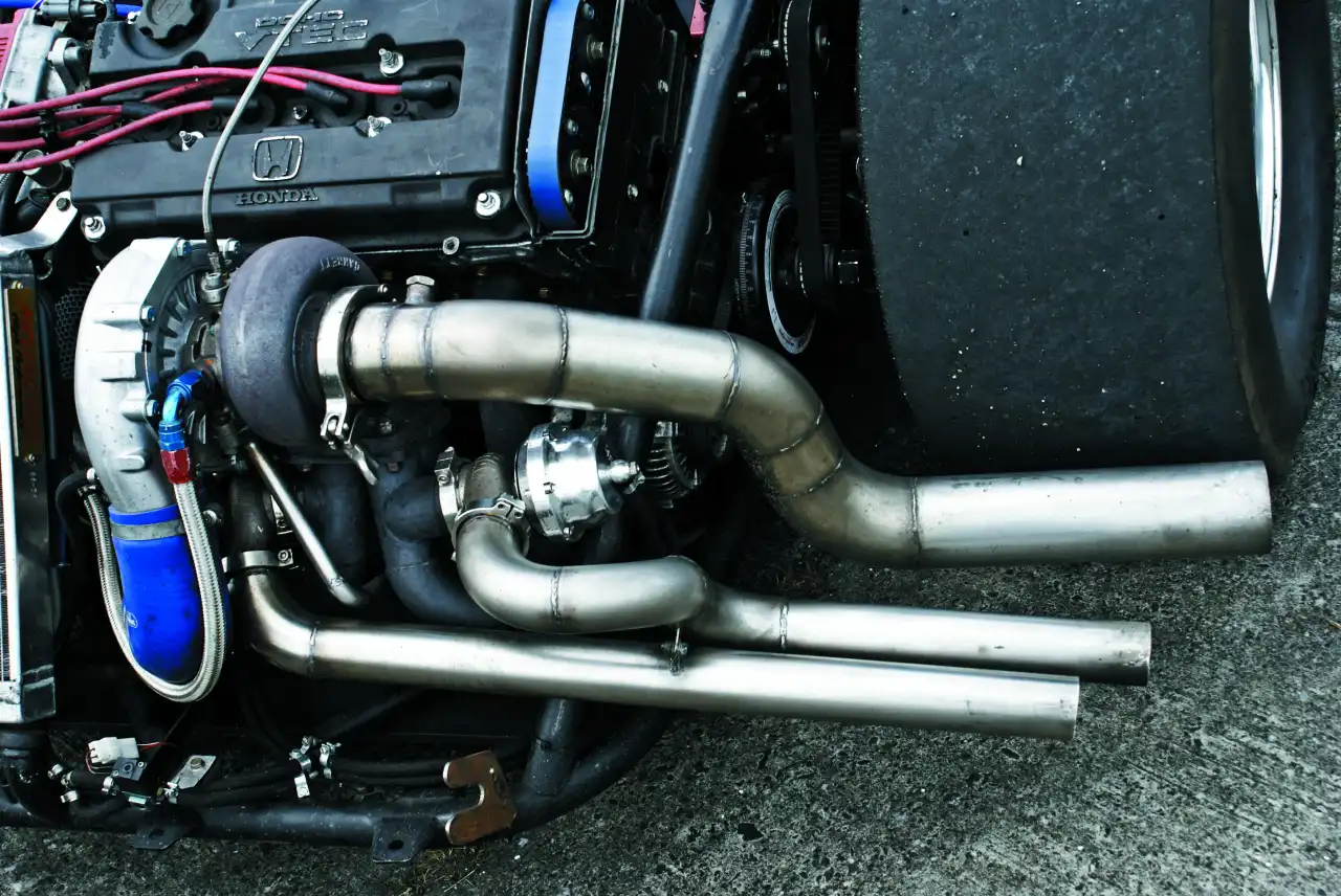 Многие спрашивают: неужели хондовским моторам с их дикими оборотами хватает такого маленького радиатора? Посмотри на фото: это хондовский мотор с наддувом, а размер радиатора такой же, хоть сам он, ясное дело, не стандартный, а от Fluidyne. Вот тебе японская инженерия. Кстати, о наддуве. Радиатор есть, а где же интеркулер? Хозяин машины сумничал и тут. Интеркулер теперь жидкостный и представляет собой алюминиевый бак в левой задней части подкапотного.