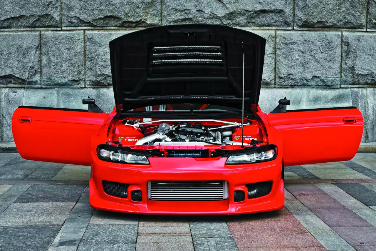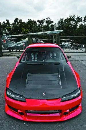 В новом пожарно-красном цвете, покрывающем все поверхности снаружи и внутри, до которых смог добраться краскопульт, S-14a выглядит просто фантастически сексуально. Огромную роль в создании горячего образа играют широченные кованые 18-дюймовые золотые диски BBS RG-R. Поклонники данной разновидности транспортных средств заметят еще одну особенность, великолепно выделяющую автомобиль на фоне соплеменников. Заметна эта особенность, если обойти автомобиль кругом и сравнить корму и нос, после чего становится понятно: кузов стоически перенес новомодную пластику "лица" и стал, возможно, первым 200SX в России с пересаженной передней частью от пятнадцатой "сильвии"! (вторая – у Тимофея Кошарного из CHE Drift Team). Детали передка, правда, не стоковые, а от японского кузовных дел мастера C-West, с редко встречающимися на просторах России аэродинамическими карбоновыми сплиттерами на переднем бампере, которые создают дополнительную прижимную силу. По заверениям C-West, бодикит продут в аэродинамической трубе и действительно работает. Кстати, первоначально пытались установить обвес Origin Aggressive Line, но он не подходил по размерам, да и качество оставляло желать лучшего.