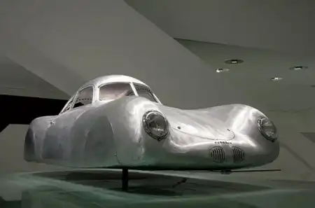 Porsche Type 64 Coupe 1938/39 года выпуска. Единственный довоенный Porsche - Type 64 Coupe – был создан для гонки Берлин-Рим, которую пришлось отложить из-за начала Второй мировой. Лишь один автомобиль из трех довоенных пережил войну, однако немецкий автопроизводитель вручную собрал точную копию с оригинальных чертежей для своего нового музея. В США автомобиль никогда не выставлялся. (Porsche of North America)