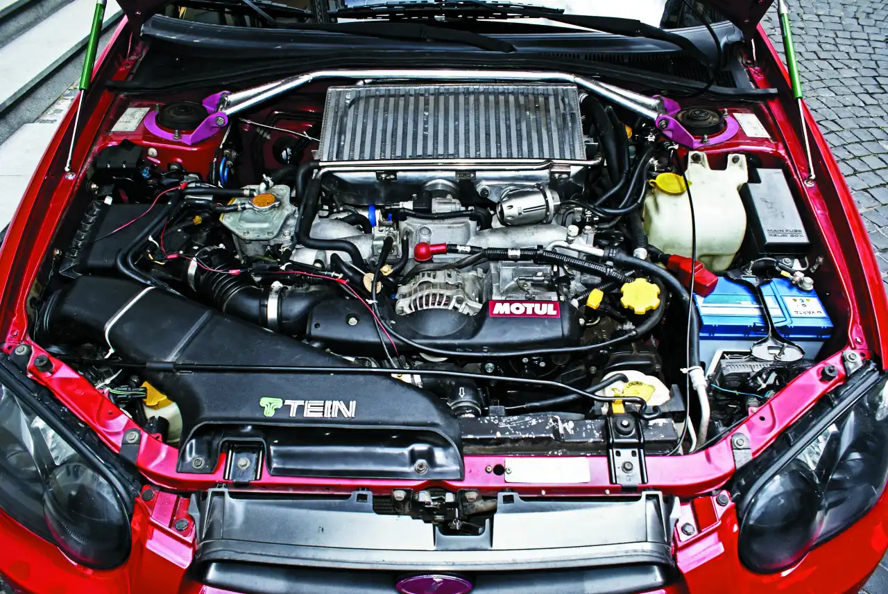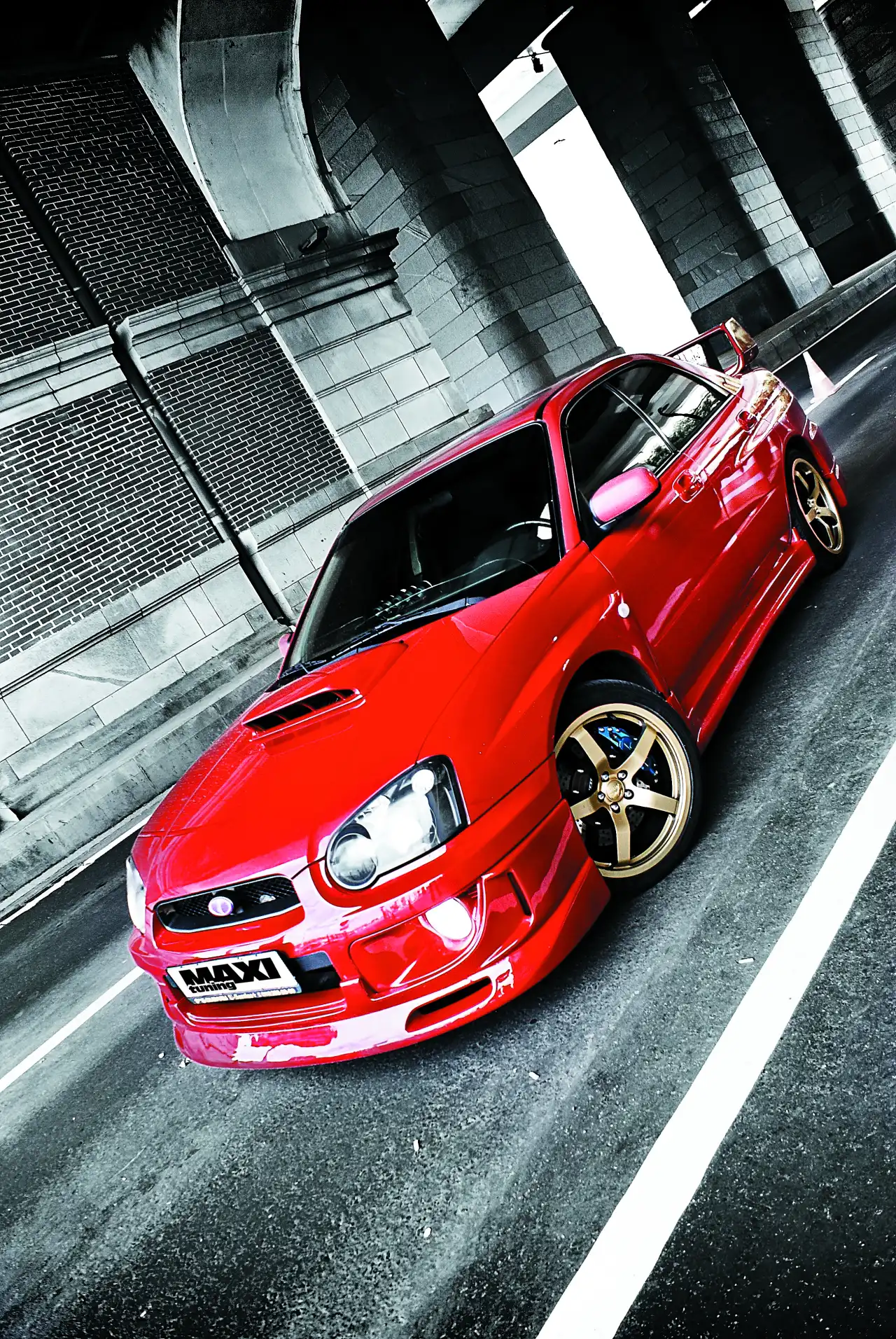 Анализируем. Для начала обсудим главные ассоциации, описанные выше. Без воздухозаборника в капоте стиль WRC моментально исчезает, поэтому данный девайс из разряда must have. Как и антикрыло, которое на данном автомобиле в максимальной степени приближено к раллийным образцам благодаря четырем перегородкам Perrin. Удовольствие это не из дешевых, потому что за каждую перегородку пришлось выложить по 120 президентов Вашингтонов. Многоспицевые диски приелись, поэтому выбор пал на популярные в России кованые AG Forged. "Они легче японских и стоят дешевле, а прочность одинаковая", – объясняет Антон. Ступинские диски заказывают даже раллисты, выступающие на чемпионате России. Что характерно, цвет дисков оставили классическим, золотым. Однако синий цвет кузова сочли баяном, поэтому после установки американского обвеса Chargespeed машину перекрасили в насыщенный красный. Для Subaru это редкое сочетание, а потому вдвойне выигрышное.