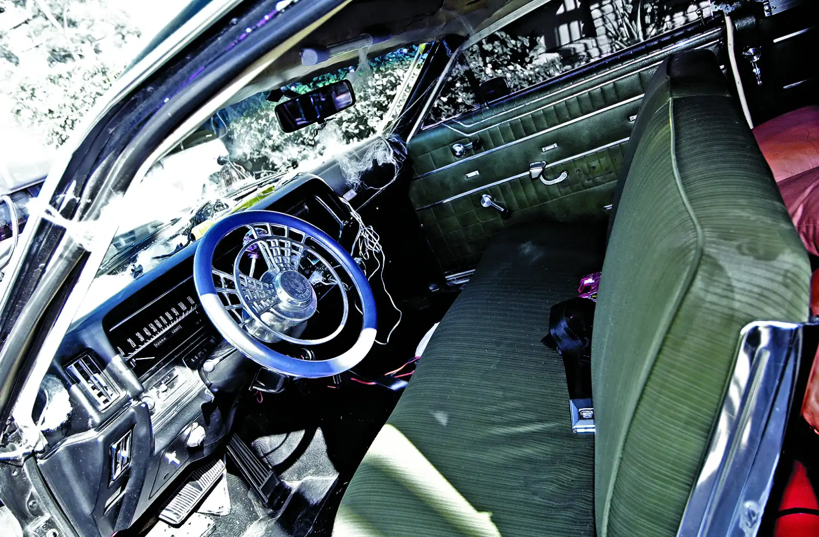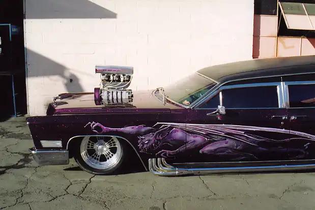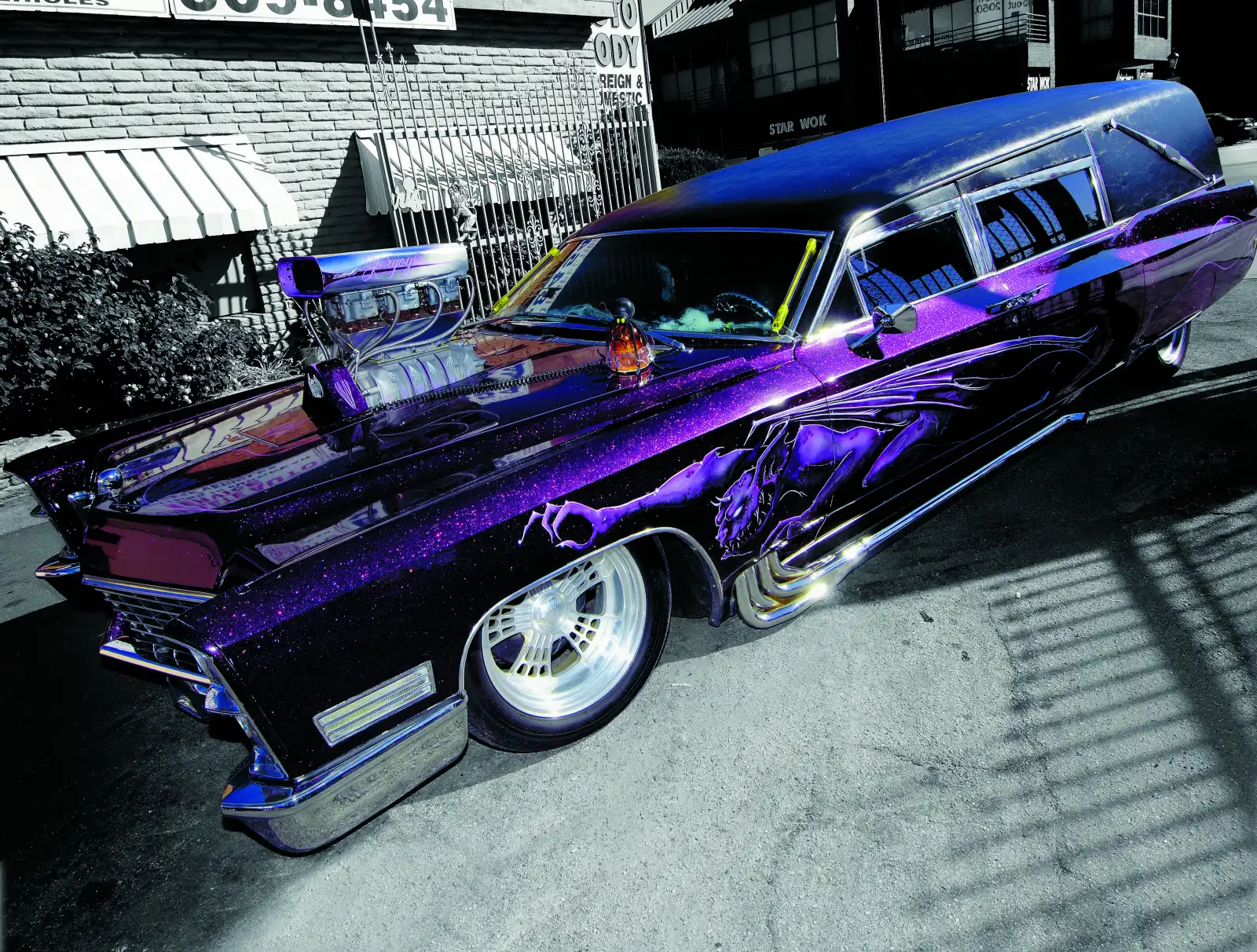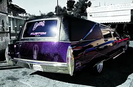 Barris Kustom Industries уже строил тюненый катафалк – для фильма 80-х годов «Ужас на колесах». Это был сиреневый кадиллак с золотистыми скульптурами на капоте и крыльях – кстати, тогда такая лепнина была в моде и ценилась в похоронных бюро. Для нового кастома Бэррис взял такой же Cadillac Miller Meteor. Причем отобрал его у собственного сына (уж не для бати ли тот его приобрел?). Тачка, кстати, крутейшая. Представь себе: в шестьдесят (!) седьмом (!) году у нее были гидроусилитель руля, электропривод сидений и 360-сильный движок! (Унылое замечание: у нас и спустя 40 лет таких машин нет…)