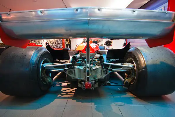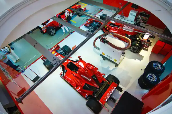 На первом этаже, там где мы начинали экскурсию, представлены автомобили Формулы 1 современной эры. На кадре показано, что из себя представляют боксы команды по время Гран-при. Единственное но, с 2010 году вы не увидите такие большие заправочные машины, способные впрыскивать топливо со скоростью до 12л в секунду.