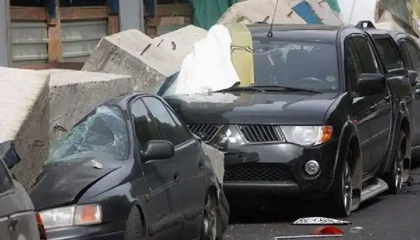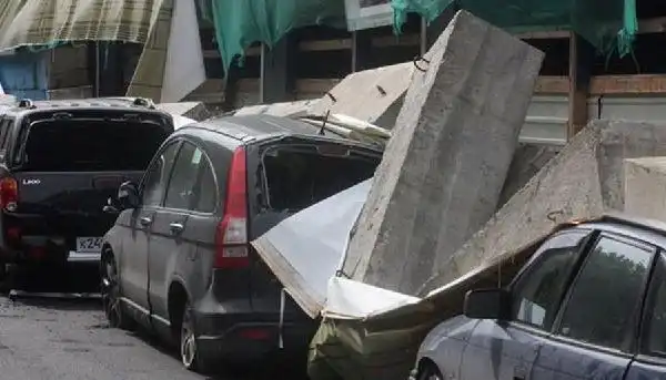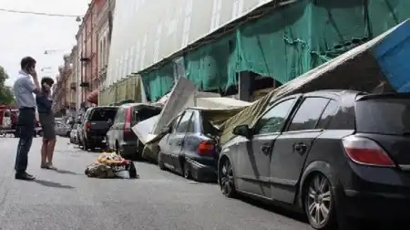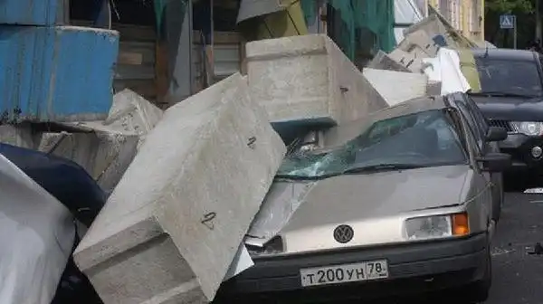 Здоровенные плиты свалились на шесть припаркованных машин. ЧП произошло 11 июня на Конногвардейском бульваре. Это здание сейчас на ремонте, а вот в Манеже, расположенном напротив, проходит очередная выставка. Именно сюда и приехали горожане. Свои машины они припарковали прямо у строительного забора. Как оказалось, сделали люди это зря. Забор перед зданием, был сделан из бетонных плит. Они слетели вниз и оказались прямо на крышах машин. У некоторых только помяты капоты и разбиты лобовые стекла. А вот другие — расплющены. По официальным данным погибших нет. Одна из плит, прижала мужчину, находившегося в машине, но ему помогли выбраться еще до приезда спасателей.