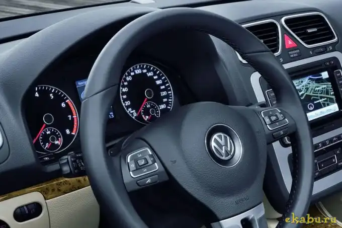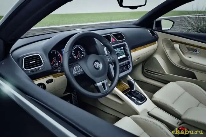 Внутри Volkswagen Eos оборудовали новой по-гольфовски оформленной центральной консолью, приборной панелью с цветным дисплеем между шкалами