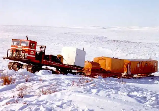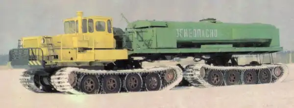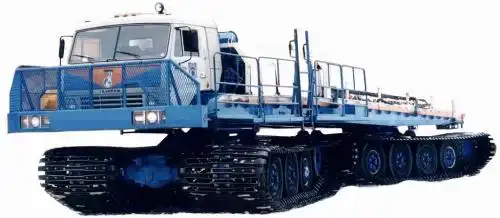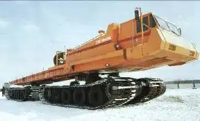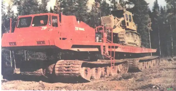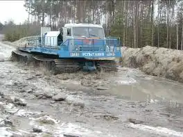 Хотелось бы рассказать о снегоболотоходе, который был построен всего в двух экземплярах и явился наверно верхом снегоболотоходной техники. Встречайте СВГ-701 «Ямал», опытный образец был создан в конце восьмидесятых годов при сотрудничестве СКБ «Газстроймашина» и канадской фирмой FOREMOST, «Ямал» предназначался в первую очередь предназначен для добытчиков нефти и газа. Его платформа рассчитана на установку буровой системы для работы на вечной мерзлоте. Он приспособлен для перевозки труб большого диаметра в самые труднодоступные районы. А смонтированная на задней части платформы гидравлическая лебёдка с тяговым усилием 45 т позволяет выполнять практически любые операции по загрузке и разгрузке – и при бурении, и при транспорте, Причем на его платформе можно смонтировать гидравлический полноповоротный кран грузоподъёмностью 140 т с 44-метровой стрелой, либо оснастить его стрелой гидравлического экскаватора с ковшом ёмкостью 2,5 – 4,2 кубометра. Его платформе можно было создать передвижную электростанцию, гигантскую пожарную машину, но в развитие техники вмешался печально известный 1991 год и дальше экспериментальных образцов дело не пошло, да и то они сейчас где то гниют в районах нашего Крайнего Севера, где проходили испытания, хотя технические данные у машины были не самыми плохими: машины всех модификаций рассчитаны на северное и таёжное бездорожье, преодоление бродов и топей глубиной до 2,5 м. . Кабина и дизель мощностью 705 л.с. расположены на достаточной высоте. Резинометаллические гусеницы шириной 1,85 м обуславливают сравнительно малое удельное давление на грунт – максимум 0,4 кг/кв. см. С платформой ходовая часть соединена опорно-поворотным шарниром, что делает машину довольно маневренной – радиус поворота при общей длине 20 м составляет всего 22 м. Для лучшей проходимости, успешного преодоления различных препятствий гусеницы оборудованы автоматическим механизмом регулировки натяжения. Едва натяжение гусеницы превысит расчётную величину 5 т – это случается, скажем, при наезде на бревно или валун, - гидроцилиндр переместит ось натяжного колеса, ослабляя натяжение и предохраняя гусеницу от разрыва. 2120-литровый топливный бак позволяет без дозаправки преодолеть 750 км по маршруту средней трудности.