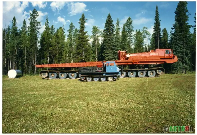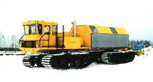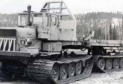 болотоход «Тюмень» БТ361А-01, разработанный в СКБ «Газстроймашина» под руководством главного конструктора проекта Васильева O.K. и изготовленный на Кропоткинским экспериментальном машиностроительном заводе Миннефтегазстроя СССР в 1978-1980 гг. Транспортер включает две секции-тележки, каждая из которых имеет по два гусеничных обвода. 12-цилиндровый четырехтактный дизель ЯМЗ-240БМ с V-образным расположением цилиндров и номинальной мощностью 220,8 кВт при 1900 об/мин расположен на передней секции перед цельнометаллической двухместной герметизированной (с отоплением и вентиляцией) кабиной управления. За кабиной расположен поворотный круг с сцепным устройством для грузовой платформы. В передней части грузовой платформы находится лебедка с силой тяги 196 кН и длиной троса 70 м. Трансмиссия механическая, имеет 16-скоростную четырехрежимную коробку передач с гидравлическим без разрыва потока мощности переключением передач на каждом режиме. Карданные передачи открытого типа с игольчатыми подшипниками. Ведущие мосты оснащены самоблокирующимися дифференциалами с муфтами свободного хода. Конечная передача выполнена в виде однорядного планетарного редуктора. Гусеницы резинометаллические из резинотросовой ленты толщиной 18 мм. Ширина гусениц 1200 мм. Размеры гусениц обеспечивают среднее давление на грунт qcp при грузе массой 27 т и при погружении гусениц на 140 мм 0,33 кг/см2. Каждый гусеничный обвод имеет по четыре обрезиненных опорных катка. Изменение направления движения транспортера обеспечивается с помощью силовых гидроцилиндров, которые поворачивают гусеничные тележки относительно друг друга в горизонтальной плоскости. Радиус поворота 17 м, а относительный диаметр поворота Dотн равен 1,09.
