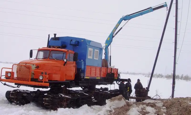 Далее стоит написать тоже о чтырехгусеничной машине, которую сейчас выпускает Екатеринбургский завод специализированных машин «КОНТИНЕНТ» , фактически это Урал-5920, однако с более мощным двигателем ЯМЗ 238М2 и усиленной рамой, а так же современной гидравликой поворотного механизма и резинометаллическими гусеницами с повышенным ресурсом, машина получила название ТС (транспортер снегоболотоходный), Урал-5920 ведет свою историю от НАМИ – 0157БК который был разработан на базе Урал-375Д в 1972 году. Транспортер был выполнен по вагонной схеме. При этом рама автомобильного типа была несущим элементом и опиралась на две одинаковые оригинальные гусеничные тележки через два опорно-поворотных устройства, правда испытания выявили ряд недостатков таких как недостаточная проходимость из-за малого дорожного просвета и ненадежности некоторых элементов ходовой части, однако эти недостатки были устранены и машина пошла в серию. Двигатель поставили дизельный КамАЗ-740 мощностью 210 л.с.