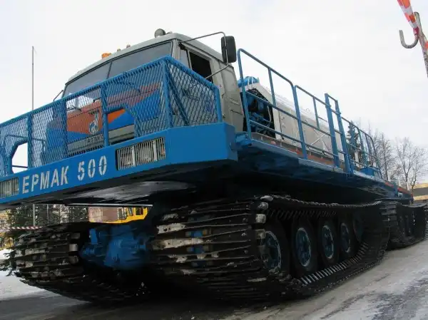 «Ермак» - покоритель снегов и болот. Эти машины при усиленной (по сравнению с обычными вездеходами) проходимости и мощности обеспечивают комфортные условия для работы. Снегоболотоход, как видно из названия, предназначен для работы в условиях полного бездорожья. Он перевозит на себе 40 тонн полезного груза при полной массе почти 90 тонн. Повышенная проходимость достигается широкими гусеницами (1500 мм, это в два раза больше, чем у танка) и способностью развивать тяговое усилие в 70 тонн. За счет большой площади гусениц (не металлических, как у танка, а специальных — резинометаллических) давление на грунт при максимальной загрузке не превышает 0,3 кг на квадратный сантиметр, это вдвое меньше, чем у стоящего взрослого человека. Малая нагрузка не только дает «вседорожность», но и снижает ущерб природе, ведь в тундре след от обычного вездехода зарастает не один год. Машина способна преодолевать глубокие броды (до 1,8 метра): у нее увеличен дорожный просвет. Подобная техника удобна и выгодна для прокладки и ремонта ниток газопроводов в тайге и тундре. Приемка заказчиком головного изделия дает надежду на начало серийного выпуска. На базе шасси можно устанавливать экскаватор, кран, бурильную установку, цистерну. До недавнего времени единственным в мире производителем большегрузных машин этого класса была канадская фирма «Формост».