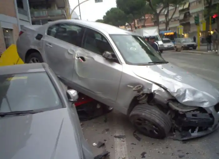 Да вы чё!!! Как это ферари въехала в бумер, что у того аж переднее колесо вырвало?! Логику включите! Э то бумер нёсся врезался в очто то колесом, его винтануло и он приземлился на ферари и тойоту!