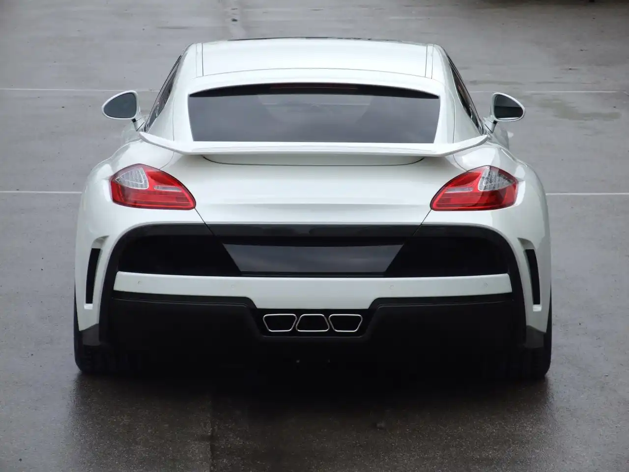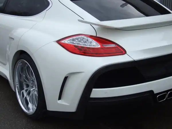 Далее взгляд очень быстро падает на увеличенные крылья, которые в задней части приспособленные настолько элегантно, что само транспортное средство больше кажется двухместным купе, нежели 4-дверным седаном. Кроме того, боковые юбки изящно создают соединительную линию между передней и задней частью автомобиля, а завершает внешний дизайн задний спойлер, установленный таким образом, чтобы направлять оптимальный воздушный поток, исходящий от крыши, на обеспечение максимальных рабочих характеристик транспортного средства. Также, в задней нижней части кузова Porsche Panamera был добавлен новый трапециевидный диффузор, расположенный по центру.
