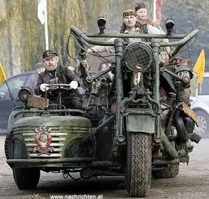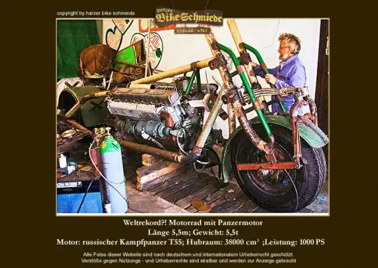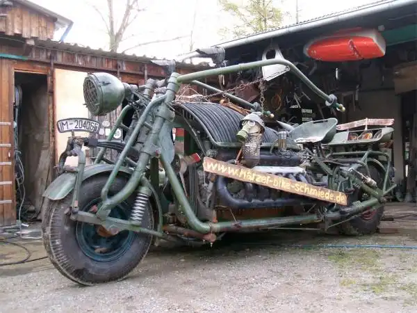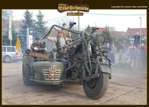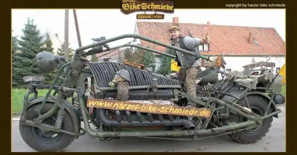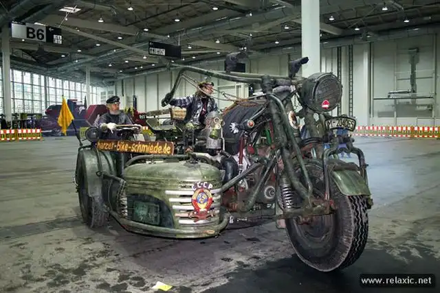 В руки мастеров немецкой компании Harzer Bike попал двигатель от советского танка Т-55. И команда во главе с Тило Нёйбелем соорудила на основе этого двигателя немецкий мотоцикл с коляской времен войны. Коляску украсил герб СССР.