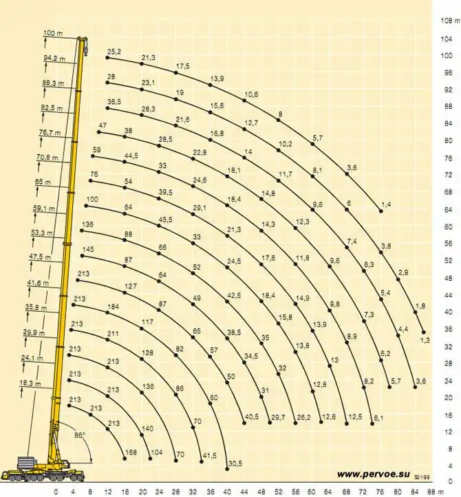 Макс. грузоподъемность — 1 200 т при 2,5 м вылете. Телескопическая стрела — 18,3 м — 100 м. Решетчатый удлинитель стрелы — 24 м — 126 м. Дизельный двигатель шасси (8 цилиндров) фирмы «Либхерр» с турбонагнетателем, мощность 500 кВт (670лс). Дизельный двигатель крановый установки (6 цилиндров) фирмы «Либхерр» с турбонагнетателем, мощность 240 кВт. Привод / рулевое управление — 18 x 8 x 18. Скорость передвижения — 75 км/ч. Вес в транспортном положении — 96 т. Общий вес противовеса — 202 т.