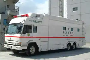 Гигантская машина скорой помощи из Японии с шестью колесами и местом для большого количества пациентов.