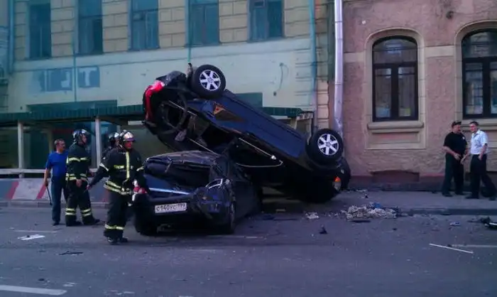 Авария Nissan GT-R на Садовнической. 6 июля вечером, произошло ДТП , Nissan GT-R на огромной скорости при не удачном меневре, на глазах у хозяина ВАЗ 2101 , который только, что прошел мимо своего авто на прогулку с собачкой , врезаясь в Копейку , бьет внедорожник под зад с такой силой, что тот подпрыгивает, переворачивается и падает на крышу другого авто, после этого в кадр попадает догоняющее колесо Nissana . Никто не пострадал.