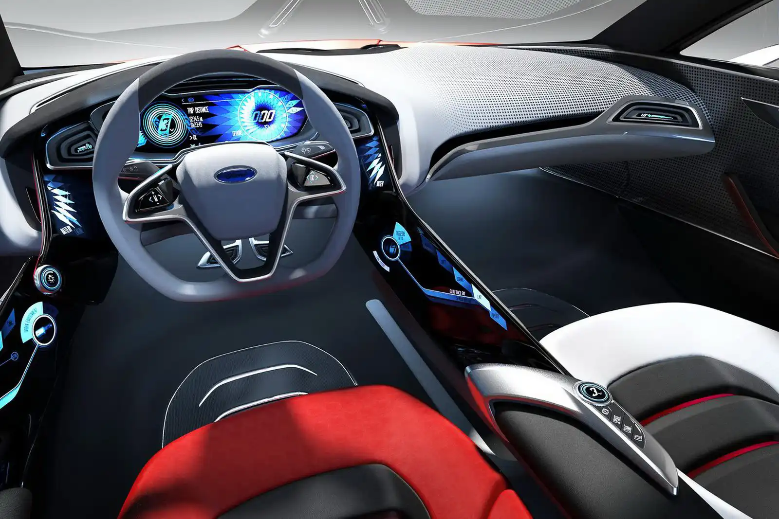 Концепт-кар призван удивить публику необычной конструкцией дверей. Все четыре поднимаются вверх, как мерседесовское «крыло чайки», причем задние двери объединены с задними крыльями. Но можно быть абсолютно уверенным, что таких экстравагантных решений серийные Форды не получат.
