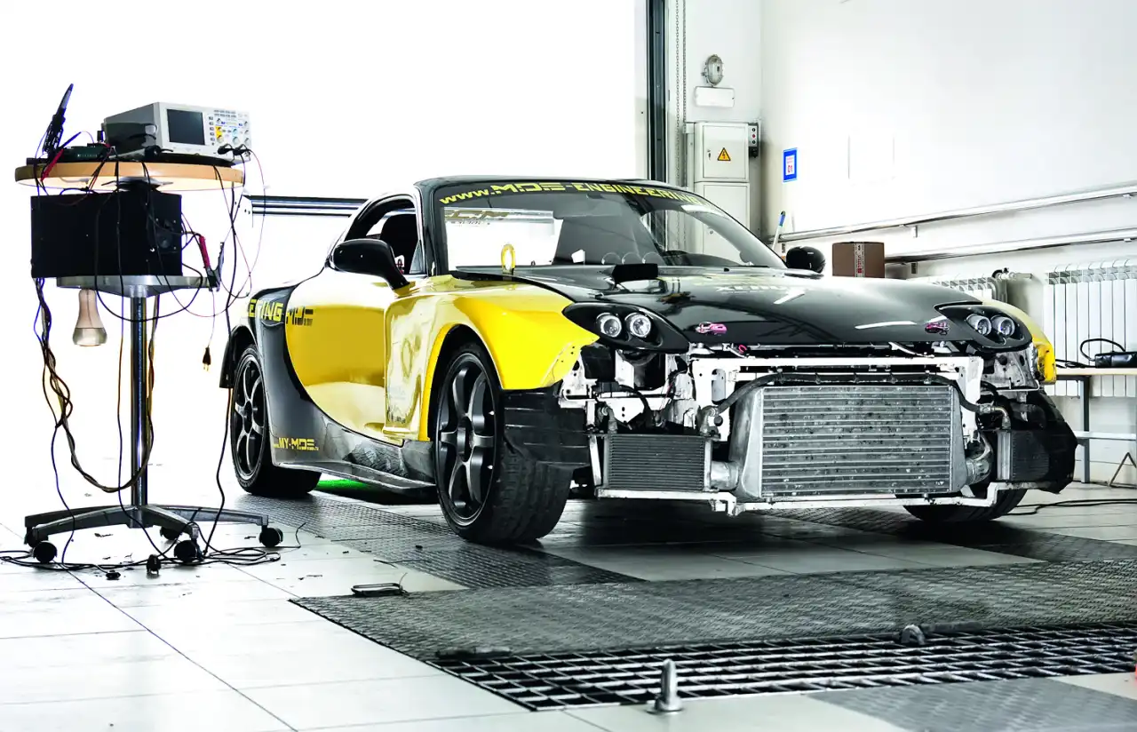 В случае с этой "рыксой" вскрытие мотора было ненапрасным: масляные форсунки уже давали сбои в работе, а недостаток масла смертельно опасен для ротора. Был произведен капитальный ремонт двигателя, и усилены угловые лезвия роторов (апексы), в расчете на будущие нагрузки. Ввиду того что мотор RX-7 имеет склонность к перегреву, а стандартная система охлаждения слабовата для постоянных нагрузок, какие возникают на кольце, она тоже подверглась тюнингу. На машине уже были установлены радиатор большей мощности, интеркулер ARC и масляные радиаторы GReddy, к этому набору добавили спортивный термостат и дополнительный вентилятор радиатора. А после вмешательства в "мозги" мотора были изменены алгоритмы работы системы охлаждения.