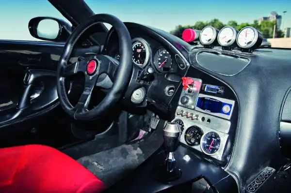 В салоне, естественно, все подчинено функциональности: жесткие "ковши" с суровыми ремнями Sparco и уйма датчиков. Так как катать девочек и слушать при этом музыку в этом авто не рекомендуется (девчонки, скорее всего, станут седыми после пары кругов в Мячково), задние сиденья и акустика в RX-7 отсутствуют как класс. Более того, в борьбе за лишние килограммы пожертвовали обшивками дверей и некоторыми деталями салона. А кому весь этот комфорт нужен на гоночной трассе?