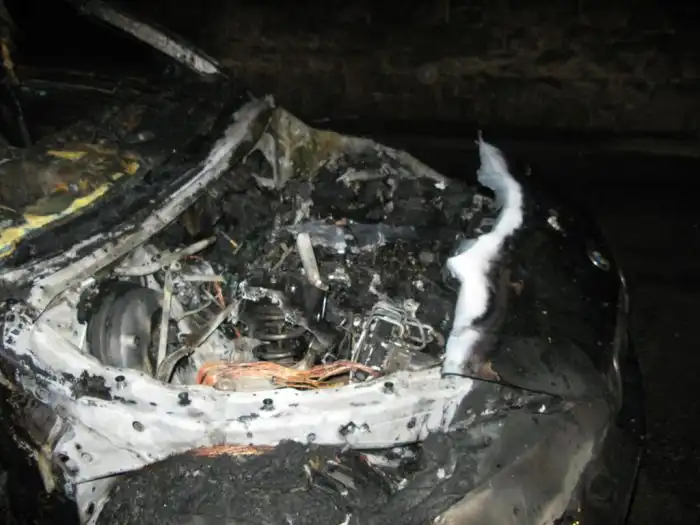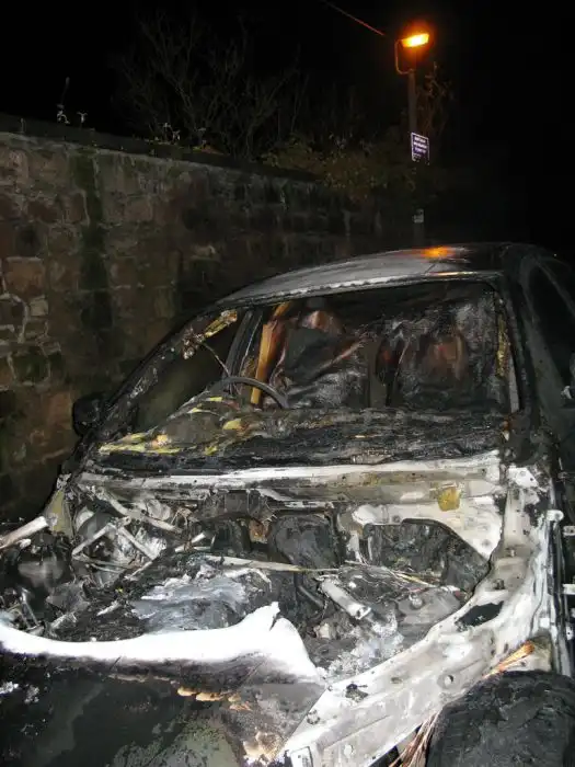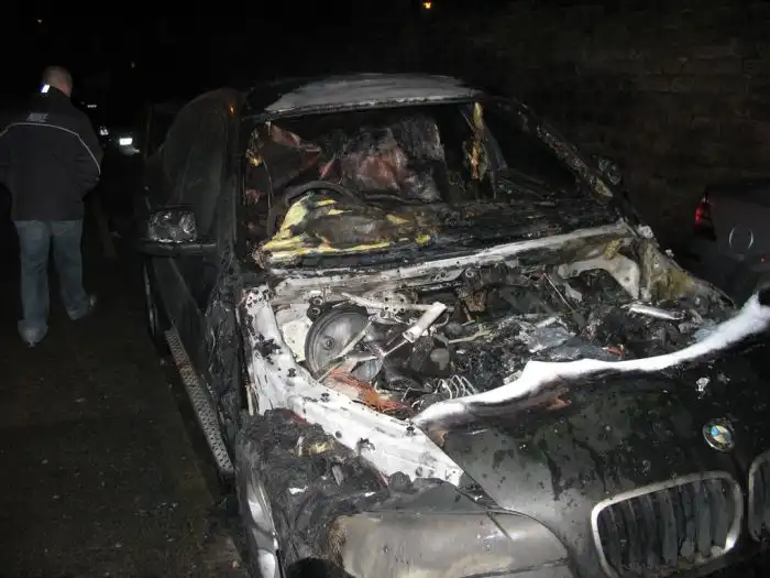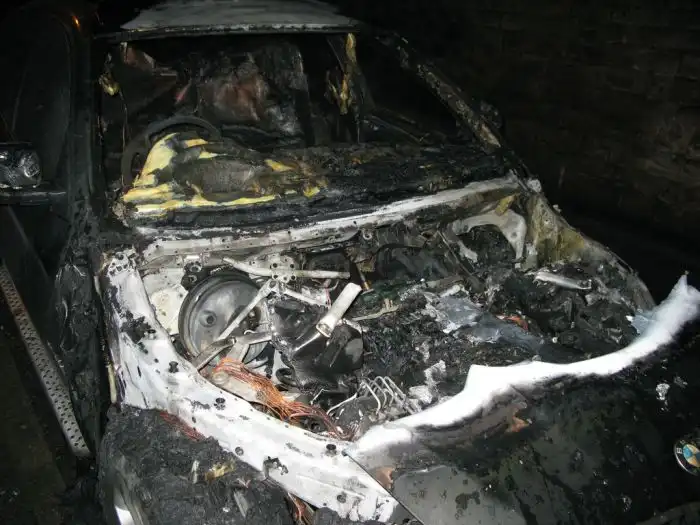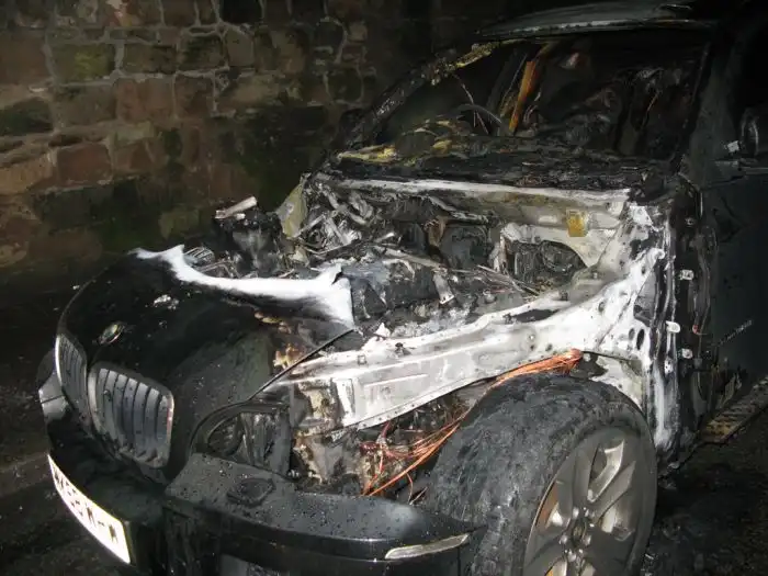 как полыхает его дорогостоящий автомобиль, припаркованный на стоянке.